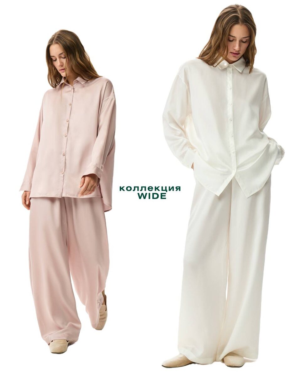 Линейка Wide была создана специально для того, чтобы носить как дома так и на улице. И если с пижамой classic и сорочкой long это произошло стихийно и от нас не зависело, то эти костюмы мы разработали уже с прицелом. Представьте: вы дома в боксерах и рубашке кроп, просто меняете тапочки на босоножки, хватаете жакет, крупные серьги и вот вы уже небрежно оделись на вечерний выход. На сайте в разделе пижамы вы найдете комплекты Wide как с боксерами так и с брюками с разными вариантами рубашек. Комплектом покупать выгоднее чем по отдельности 🤫
