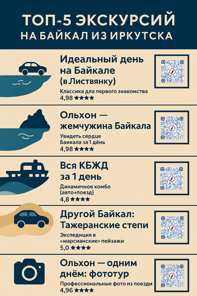 Планируете поездку на Байкал из Иркутска и теряетесь в вариантах? Я изучил десятки предложений и отобрал 5 лучших экскурсий на 2025 год. Внутри — честный разбор маршрутов на Ольхон, в Листвянку и по КБЖД: актуальные цены, реальные отзывы и советы, которые помогут выбрать идеальное путешествие и не переплатить.