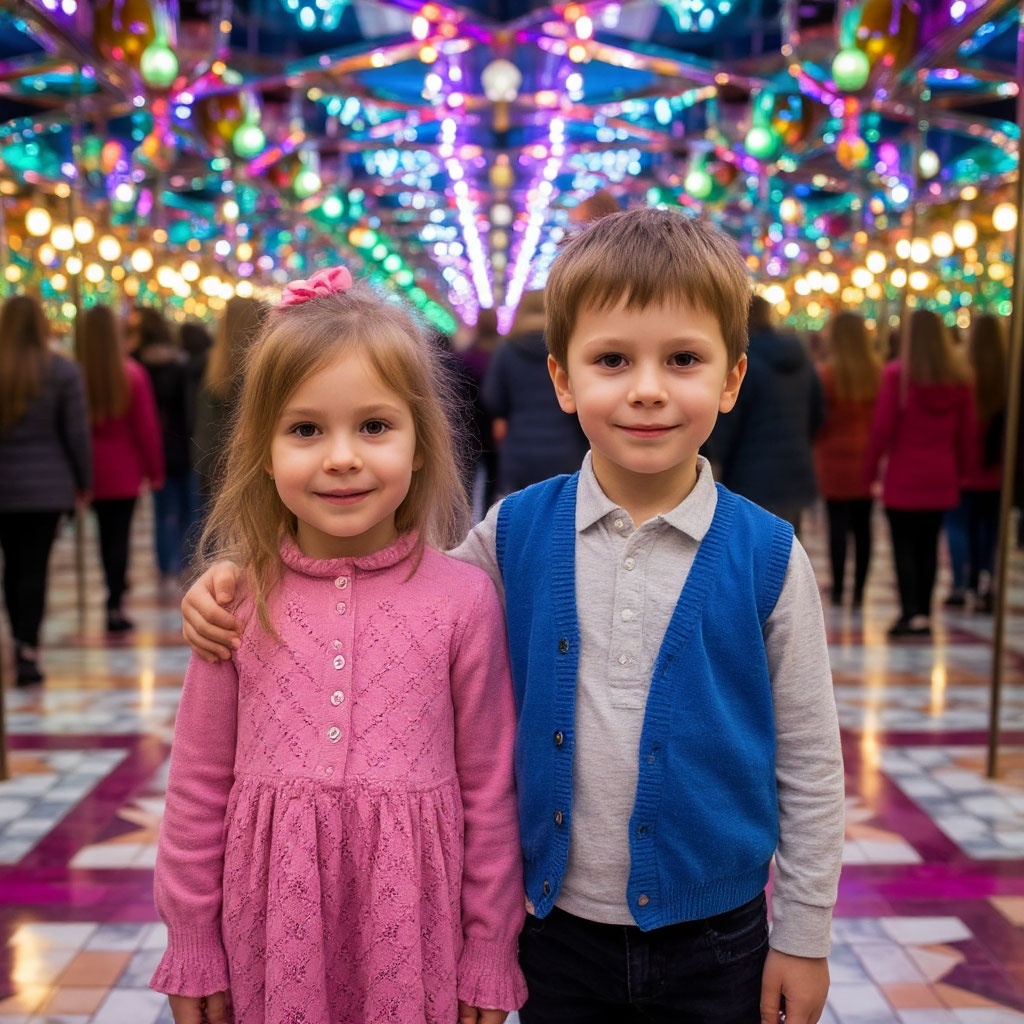 Волшебный лабиринт Тёплый летний день медленно перетекал в вечер. Маша и Дима, два неразлучных друга, уже несколько часов бродили по большому городскому парку. Они постоянно спорили – Маша любила спокойные прогулки, а Дима настаивал на активных развлечениях. То она тянула его к пруду кормить уточек, то он затаскивал её на американские горки. Их перепалки становились всё жарче. Дима называл Машу занудой, а она его – неугомонным сорвиголовой. Но несмотря на разногласия, они всё равно оставались вместе, продолжая свои споры на каждом шагу. Внезапно их внимание привлёк необычный блеск между старыми деревьями. Пробравшись через заросли, они замерли от удивления – перед ними возвышался огромный лабиринт из зеркальных стен. Его причудливые изгибы тянулись во все стороны, а на входе мерцала странная надпись, которую, казалось, никто раньше не замечал. Маша осторожно потрогала зеркальную поверхность – она оказалась тёплой и слегка вибрировала. Дима, всегда более решительный, первым шагнул