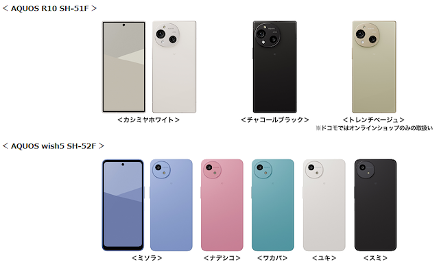 AQUOS wish5 будет доступен в следующих цветах: MISORA (небесный), NADESHIKO (розовый), WAKABA (зеленый), YUKI (белый) и SUMI (черный).