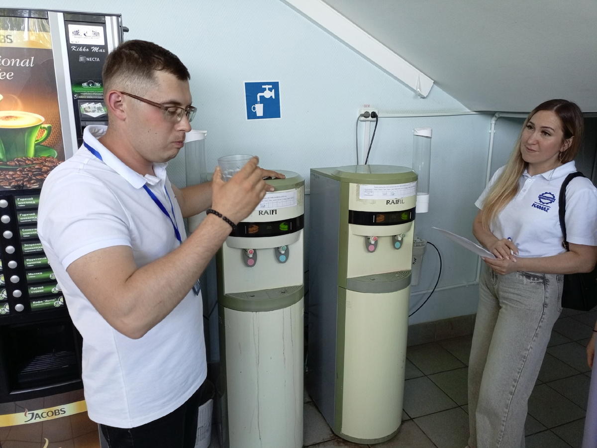 проверка обеспечения сотрудников питьевой водой. Контроль осуществляла комиссия по охране труда и рабочему контролю ОППО ПАО «КАМАЗ» в составе: Шарифуллиной Г.Б. - председатель ППО ООО «КАМАЗ-Энерго», Гилазова И.Н. – заместителя председателя профкома ПРЗ, Захаровой О.В. – ведущего инженера ООР ТФК, Валиева Р.Р. – начальника БОР ТФК