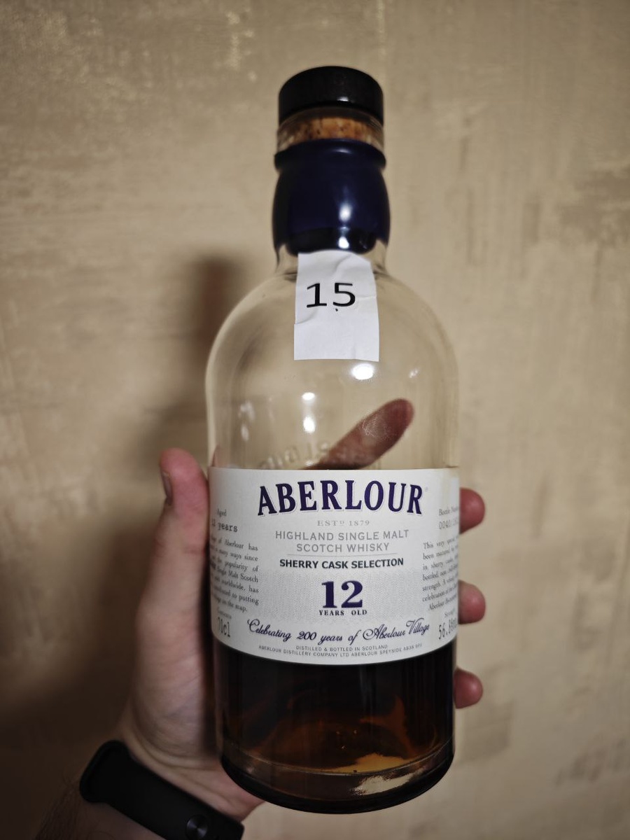Всем привет! Продолжаю публиковать дегустационные заметки о виски, который попробовал(или приобрёл семпл) на 10м Московском виски симпозиуме. Aberlour 12 лет Sherry Cask selection был создан на 200 летний юбилей деревни Аберлор. Ботл очень рарный. Одним словом перед нами лега! Спасибо Вадиму Минтусову, что поделился своим коллекционным ботлом! Количество ботлов строго 1812. (По году основания поселения.) Ботлинг 2012 года. Крепость 56.8% ABV. Бочки хересные, про свежесть и объем ничего не сказано. Разумеется без коллера и охлаждения перед фильтрацией. Перейдем к дегустационным заметкам. ЦВЕТ: чёрный чай. АРОМАТ: очень сложный и комплексный. Сразу хересная яркость, грибы и шоколад с табаком. Напоминает старые Макалланы или Гленгойн. То что это 12ка не укладывается в голове! По ароматике 18-20 лет. Единственное, что смущает, это градус и спиртуозность... слишком резко бьёт в нос. Нужно подбирать бокал. И вот когда подобрали бокал, который максимально убирает спиртуозность, можно насл