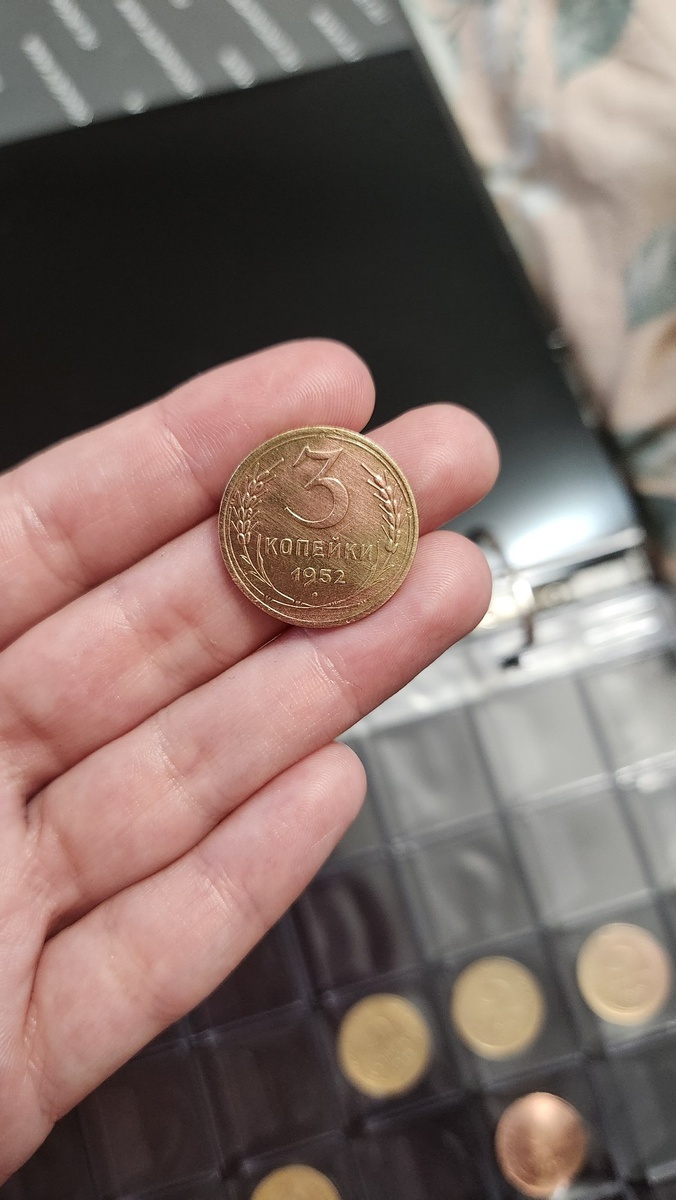 3 копейки 1952 год Алюминиевая бронза; ○ 22 мм; 3 г; гурт рифлёный; регулярный чекан СССР. Тираж 71.7 млн; 80 - 200₽ (выпуклая звезда в гербе). С плоской звездой стоимость монеты 50000-150000 ₽. #монета@fortunecove
