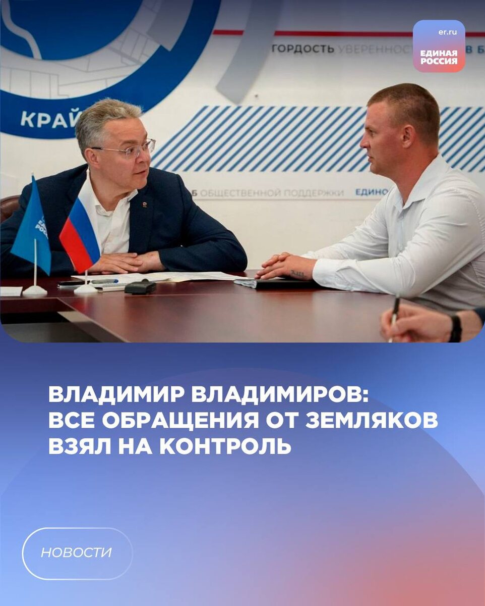 Секретарь реготделения партии провёл приём граждан. Он состоялся на базе Региональной Общественной приёмной партии. «Обратилась и семья Героя России участника спецоперации Назара Енина. Пришли с вопросом по воде: сейчас водоснабжение в селе Донская Балка Петровского округа зависит от родников. Краевому министерству ЖКХ до конца 2027 года поручил провести реконструкцию водоснабжения в селе. Встретимся с жителями, проговорим работу. С интересной идеей обратился предприниматель из Ставрополя. Предлагает на базе одного из предприятий города наладить выпуск багги – легких маневренных автомобилей. Они могут быть использованы в том числе в зоне СВО. У нас есть краевые механизмы поддержки, которые помогут на начальной стадии реализации бизнес-идеи. Краевое Минэкономразвития посмотрит проект и поможет с подачей заявки. Все обращения от земляков взял на контроль. Буду отслеживать работу по ним», – прокомментировал секретарь регионального отделения партии «Единая России», губернатор края Владими
