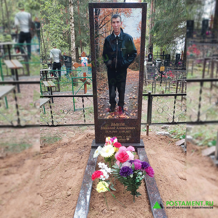 Величественный образ во весь рост, словно живой, запечатлен в обрамлении специальной ниши на лицевой стороне монумента. Под ним золотом горит высеченная пескоструем надпись, каждая буква – дань памяти и уважения. На обратной стороне стелы, словно сошедший с небес, выгравирован ангел, а ниже – эпитафия, слова которой также сияют в золотом ореоле. Вертикальный монумент из благородного Дымовского гранита особенно прекрасен в мягких лучах солнца, когда в его глубине проступает таинственный фиолетовый оттенок, словно отблеск вечности. Памятники из Дымовского гранита гармонично сочетаются с красной и серой плиткой, а также сдержанным очарованием гранитного щебня, укрывающего могилу. Лазерная или пескоструйная гравировка и бронзовые элементы – накладные буквы и фигуры – добавят утонченности оформлению. Дымовский гранит прекрасно дополняется строгой элегантностью черного габбро-диабаза: стела, выполненная из одного камня, и арка над памятником, словно сотканная из другого, создадут неповторимы