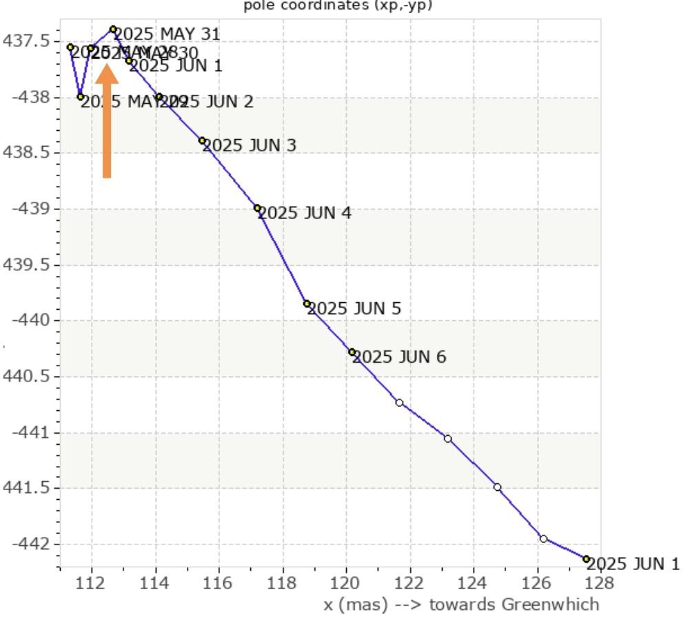 Процесс подзатянулся. Сегодня-завтра-послезавтра подходит 14-дневная гармоника от кульбита со стороны траектории полюса вращения Земли после мощных магнитных бурь (фото 1).