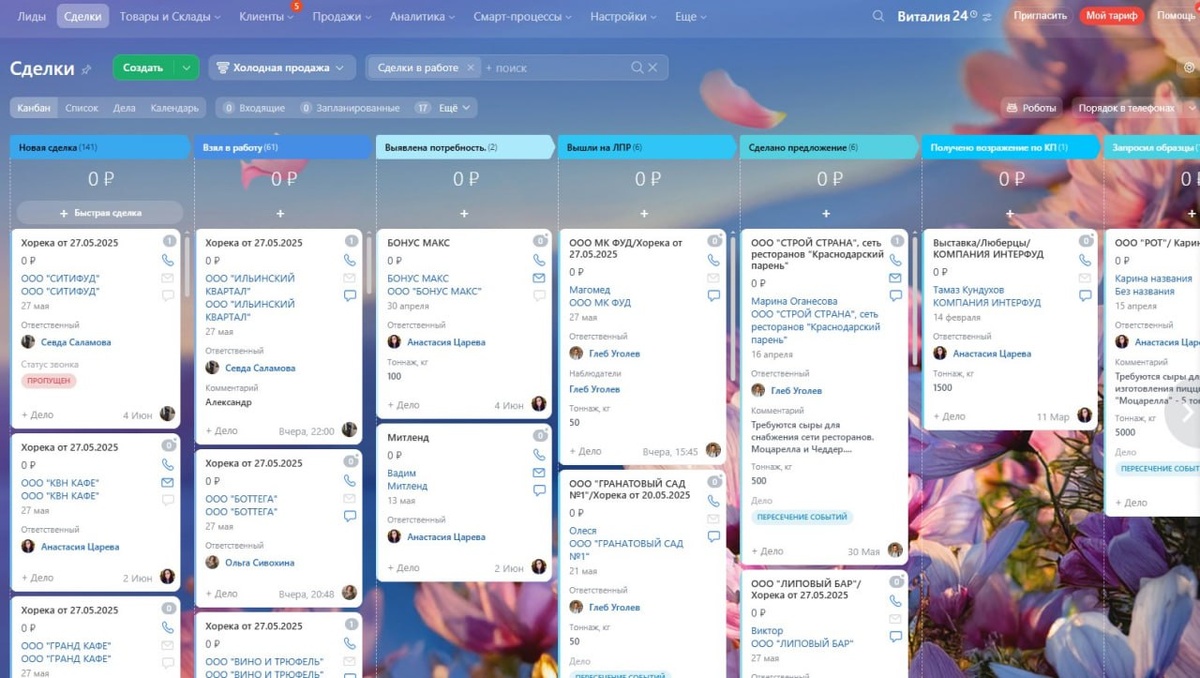 Как увеличить b2b продажи. Оптовая продажа сыра Исходная ситуация 🚦 Когда мы начали сотрудничество с компанией Vitalia, перед нами стояла задача вывести продажи на новый уровень. Основная проблема: почти вся выручка — от постоянных клиентов, а новых сделок не появлялось вовсе. Конверсия продаж — 0%, скорость обработки заявок — 28 дней, новых договоров не заключалось совсем. Это означало, что бизнес находился в зоне риска стагнации и не мог расти за счет расширения клиентской базы. Диагностика и постановка целей 🔍 Провели аудит бизнес-процессов и выявили ключевые точки роста. Было очевидно: — не хватает системной работы с новыми лидами — отсутствует аналитика по этапам воронки — менеджеры не используют современные инструменты #CRM Цель: не только увеличить количество новых клиентов, но и выстроить прозрачную, управляемую систему продаж, где каждый этап можно анализировать и оперативно корректировать. Внедрение инструментов #CRM 🛠 — Автоматизация воронки продаж: Настроили этапы