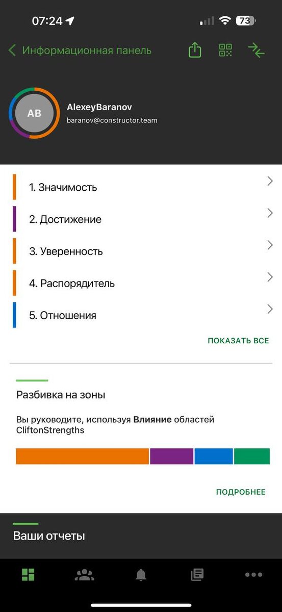 Недавно получил такой вопрос от человека, который не является моим клиентом. И, честно скажу, мне очень нравится на такие вопросы отвечать. Потому что я — не только за клиентов. Я — за людей. 📍 Вопрос действительно важный. Потому что сам по себе отчет CliftonStrengths — это уже огромная ценность. Да, он на английском. Но даже если вы не свободно владеете языком, перевод в ИИ (например, в ChatGPT) даст вам достаточно качественный, понятный текст. Уже с него вы многое поймете о себе. Что делать после прохождения теста? Вот мой минимальный «суповой набор» шагов: 1. Прочитайте отчет. Но не за один раз. Полный отчет Gallup — около 31 страницы. Я бы рекомендовал растянуть чтение на 10 дней или пару месяцев. Берите каждый талант по очереди, изучайте, наблюдайте за собой, спрашивайте обратную связь у близких. Это потрясающая практика самопознания. 2. Примите свои таланты. Все 10. Очень часто я слышу: — Вот эти 7 прям про меня, а эти 3 — вообще нет. Но CliftonStrengths — очень точный инструмен