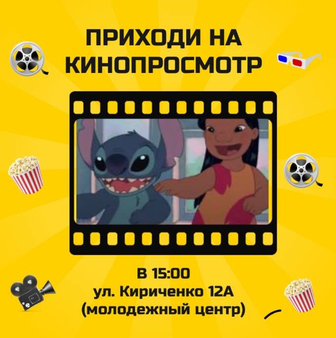 🎬 Кинопросмотр сегодня! 🍿 Приглашаем всех желающих на совместный просмотр крутого фильма! ⏰ Время: 15:00 📍 Место: Молодёжный центр (ул. Кириченко, 12а) Будет уютно, интересно и вкусно (приносите с собой хорошее настроение и немного попкорна 😉). Приходи сам, зови друзей – будем смотреть кино вместе! 🎥✨