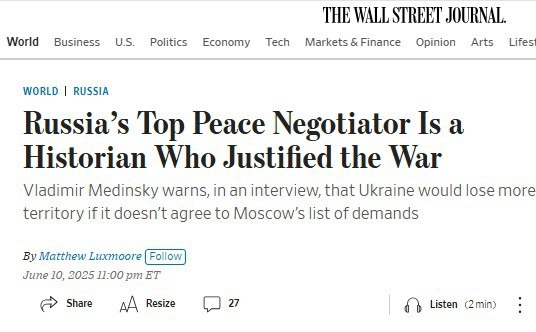 Украина потеряет больше территорий, если не пойдет на компромисс — Мединский в интервью The Wall Street Journal