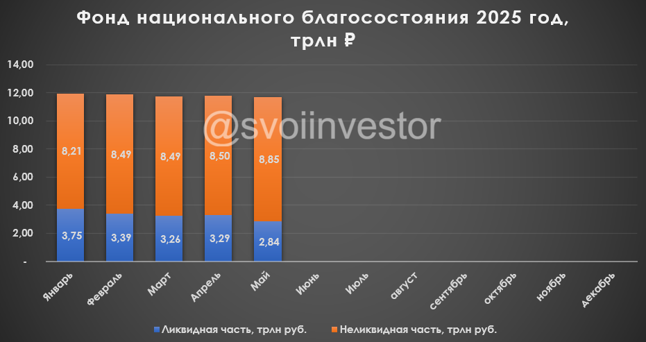 Минфин РФ опубликовал результаты размещения средств ФНБ за май 2025 г. По состоянию на 1 июня 2025 г. объём ФНБ составил 11,69₽ трлн или 5,5% ВВП (в апреле — 11,79₽ трлн). Объём ликвидных активов фонда (средства на банковских счетах в Банке России) составил 2,84₽ трлн или 1,5% ВВП (в апреле — 3,29₽ трлн). Министерство существенно нарастило инвестиции в этом месяце — 364,4₽ млрд (в апреле — 2,3₽ млрд), 300 млрд были инвестированы в банковские суборды (Сбер, ВТБ, ГПБ, Совкомбанк) для строительства ВСМ Москва-Санкт-Петербург, 47,5₽ млрд достались проекту Газпрома Усть-Луга (в прошлом году потратили 226₽ млрд, в этом уже 211,5₽ млрд). IMOEX в мае снизился на 90 пунктов по сравнению с апрелем, но неликвидная часть подросла на 350₽ млрд (спасибо инвестициям), ликвидная часть просела на 450₽ млрд из-за инвестиций (продажа валюты и золота) и укрепления ₽. 📈 Неликвидная часть активов ФНБ: ▪️ на депозитах в ВЭБ.РФ — 1105,7₽ млрд (в апреле — 1057,6₽ млрд); ▪️ евробонды Украины — $3 млрд (прощаем