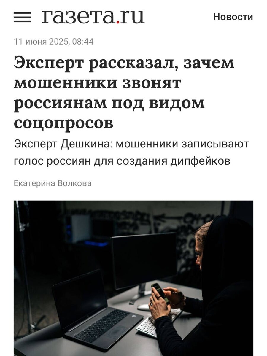 Мошенники начали массово звонить под видом соцопросов, чтобы записать голос жертвы и сделать дипфейк. Им достаточно удержать вас на линии всего 20 секунд — этого хватает для клонирования голоса. Потом от вашего имени рассылаются голосовые и даже кружочки, чтобы развести близких на деньги. ...будьте бдительны, берегите себя и своих близких...