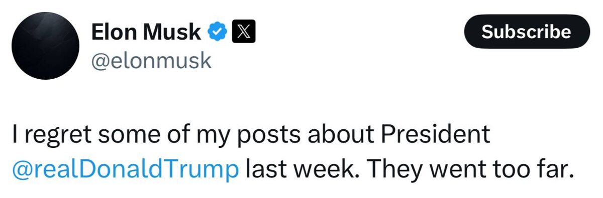 Илон Маск извинился перед Трампом «Я сожалею о некоторых моих постах о президенте Трампе на прошлой неделе. Они зашли слишком далеко», — сказал бизнесмен. Вот вам и XXI век — извиняются в сети. 👍 БайБайден. Подписаться