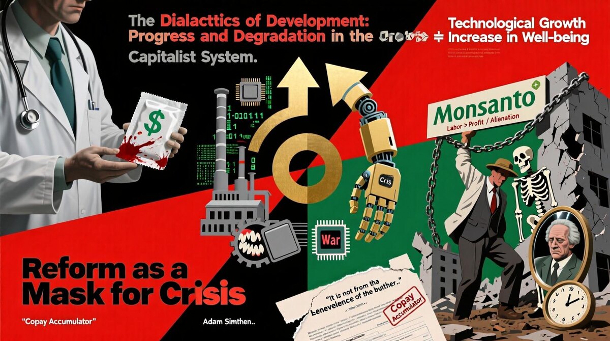 Но в чём заключается прогресс с точки зрения общественного развития? В чем он выражается? На первый взгляд, он очевиден: технологии стремительно развиваются, производительность труда растёт, открываются новые горизонты медицины, транспорта, информации. Но, по сути, это развитие направлено не на удовлетворение общественных потребностей, а на обслуживание частного интереса, интереса представителей эксплуататорского класса.