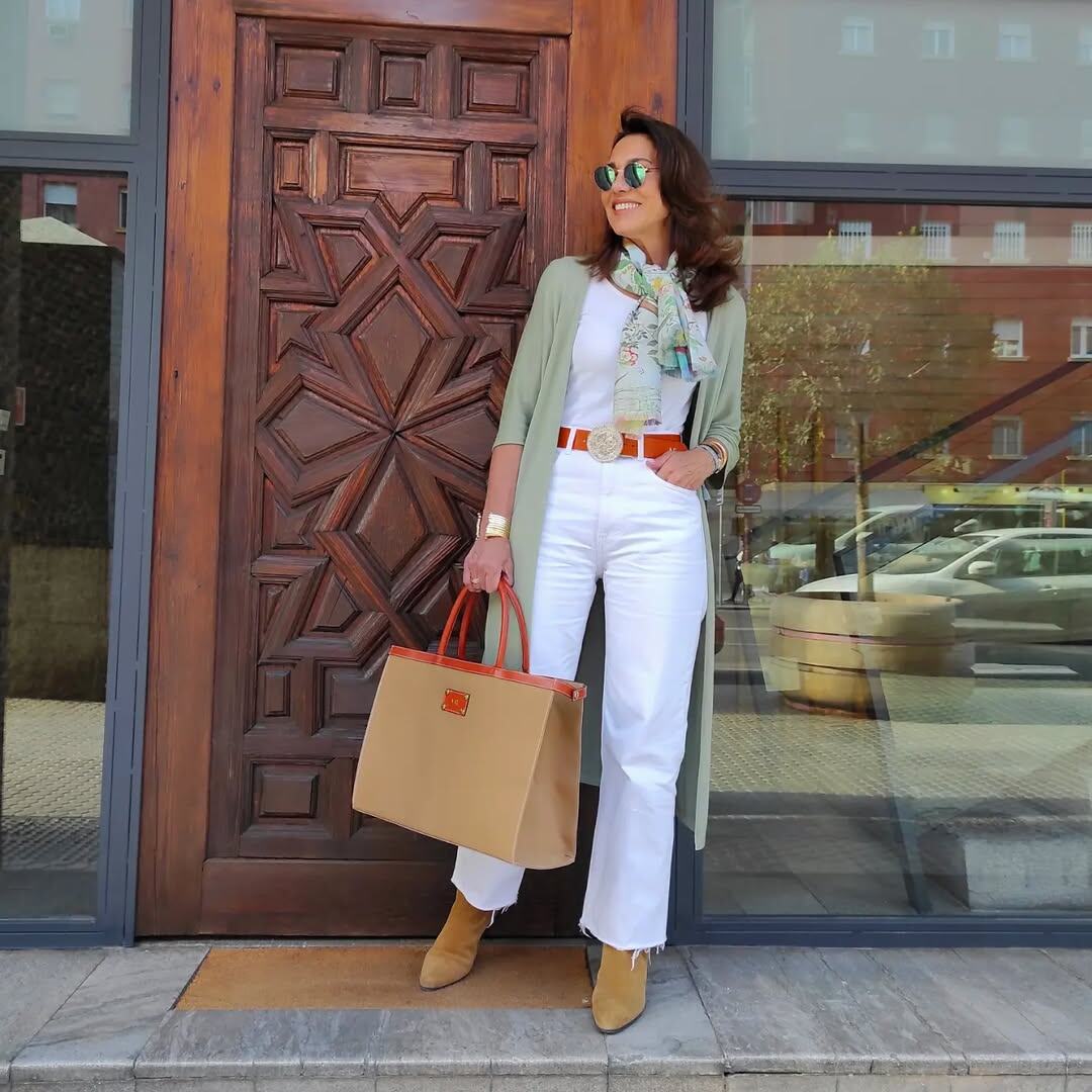 Обратите внимание: кардиган длинный, но не «давит» силуэт, потому что в образе поддержан поясом с выразительной пряжкой и высоким контрастом (белый + рыжий). А шарф усиливает эффект вертикали, особенно если вы не завязываете его в бант, а оставляете свободные концы.