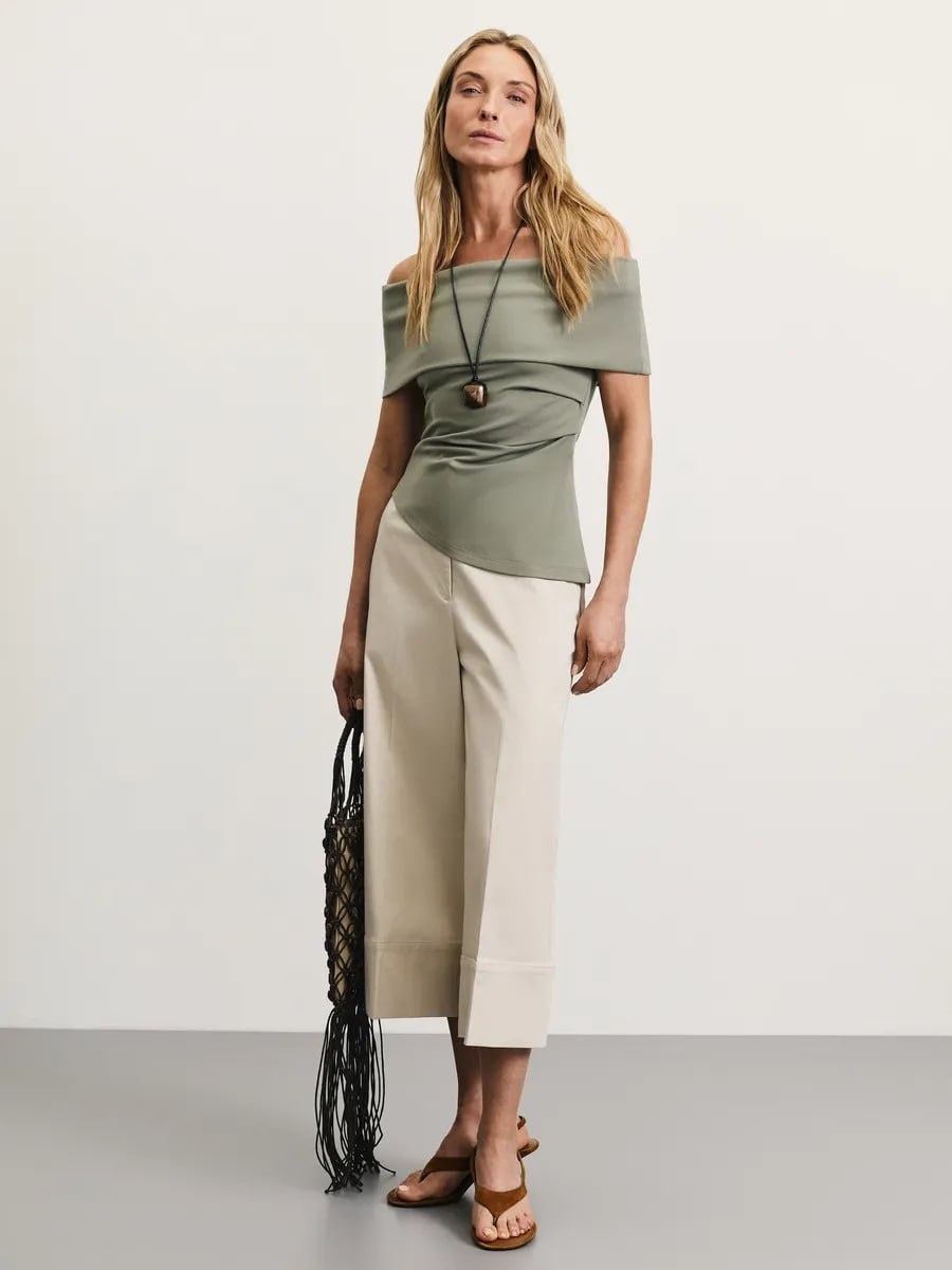 Стильная и укороченная блузка с открытыми плечами. Фасон - легкий оверсайз, без рукавов. Идеально подойдет для офиса или повседневного использования.