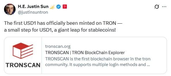 🎙 Джастин Сан заявил, что стейблкоин USD1, поддерживаемый фондом WLFI семьи Трампа, запущен в сети TRON
