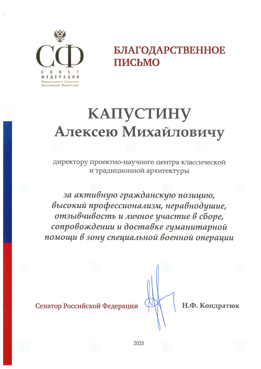 Благодарственное письмо Совета Федерации Федерального собрания Российской Федерации вручено директору проектно-научного центра классической и традиционной архитектуры Капустину Алексею Михайловичу. За активную гражданскую позицию, высокий профессионализм, неравнодушие, отзывчивость и личное участие в сборе, сопровождении и доставке гуманитарной помощи в зону специальной военной операции.