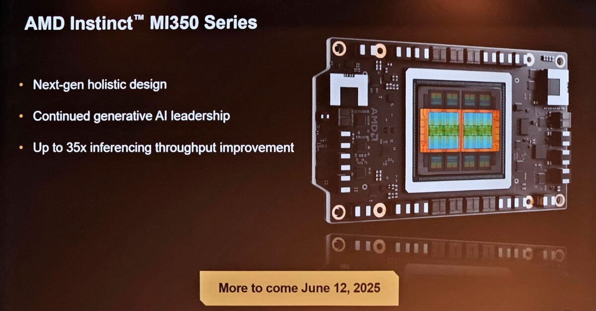 AMD запланировала на завтра мероприятие под названием Advancing AI, где ожидается презентация обновлённых ускорителей вычислений Instinct для сферы искусственного интеллекта. В числе ключевых улучшений: увеличение объёма видеопамяти для работы с большими языковыми моделями, а также повышение энергоэффективности. В обновлённую серию войдут ускорители с объёмом памяти 288 ГБ. Один из них в формате OAM (OCP Accelerator Module) был показан на выставке ISC 2025 в Гамбурге, это ранняя демонстрация перед завтрашним мероприятием. AMD также поделилась некоторыми техническими подробностями одного из ускорителей, сообщает VideoCardz со ссылкой на ComputerBase. Источник изображения: AMD, VideoCardz Instinct MI355X, построенный на базе архитектуры CDNA 4, продолжит использовать память HBM3E, максимальная пропускная способность памяти составит 8 ТБ/с. Компания стремится достичь 30-кратного повышения энергоэффективности и, судя по представленным материалам, достигает этой цели, тем не менее пиковая м