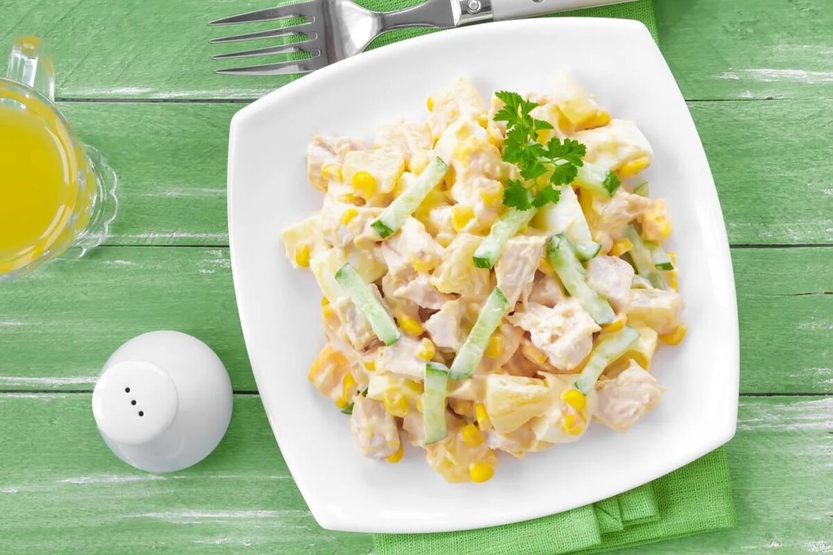 ✅ Ингредиенты: - Куриная грудка — 200 г - Ананасы консервированные кусочками — 200 г - Майонез или йогурт натуральный — 3-4 ст. ложки - Сыр твердый — 70-100 г - Огурец свежий — 1 штука среднего размера - Зелень петрушки или укропа — небольшой пучок - Соль, свежемолотый чёрный перец — по вкусу --- ⚙️ Пошаговая инструкция: 1. Подготовьте ингредиенты: - Отварите куриную грудку до готовности (примерно 20 минут), дайте ей остыть и нарежьте кубиками или полосками. - Сыр натрите на крупной терке. - Ананасы слегка обсушите бумажным полотенцем, чтобы убрать лишнюю влагу. - Огурец помойте и нарежьте небольшими кубиками. - Петрушку мелко нарубите. 2. Собираем салат: - В глубокой тарелке смешайте нарезанные кусочки курицы, сыр, огурец и ананасы. - Заправьте майонезом или натуральным йогуртом, посолите и поперчите по вкусу. - Аккуратно перемешайте, стараясь сохранить форму продуктов. - Перед подачей посыпьте сверху рубленой зеленью. --- 📖 Советы: - Для большей сочности можно добавить немного сока