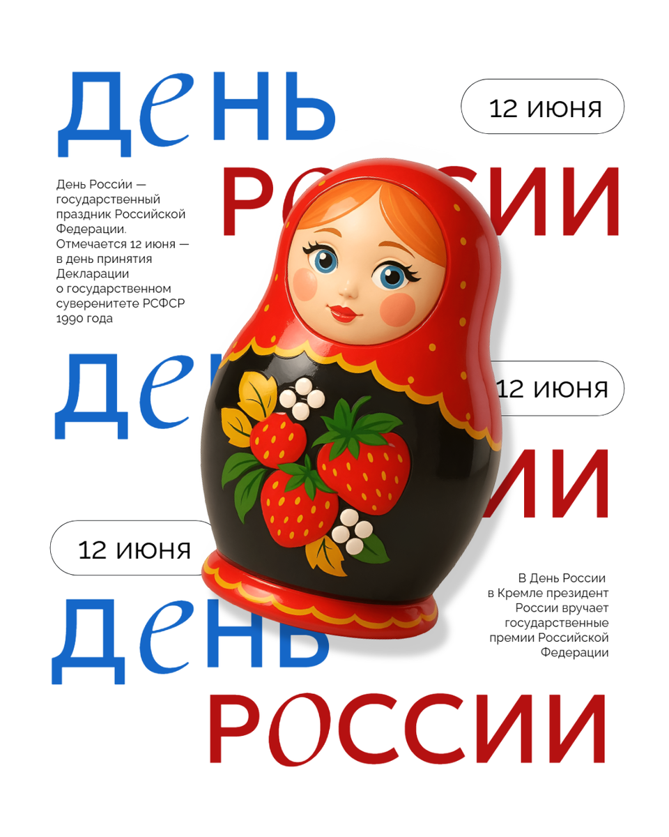День России — это праздник, который объединяет миллионы людей и напоминает нам о нашей богатой истории, культуре и традициях. Команда SMMplanner подготовила открытки к этому дню: под каждым макетом есть ссылка, по которой любую картинку можно поменять (добавить свой текст, фото, элементы и т.д) 1 — с матрёшкой 2 — Храм Василия Блаженного 3 — с пейзажами 4 — со сладостями 5 — акцентный текст 6 — в синем цвете