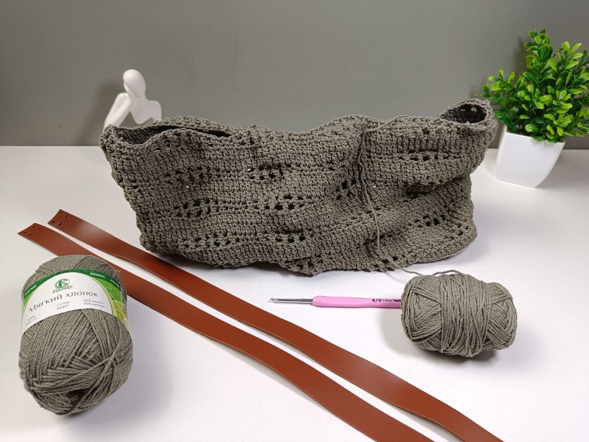 Продолжаю вязание новой сумочки 🌸 заканчиваю второй моток пряжи👍🏻 Для вязания использую крючок 2,5 мм. Пряжа Камтекс "Мягкий хлопок", цвет Полынь, 220 м/100 г. Состав пряжи: 70% хлопок, 30 % нейлон. Для сумки пришли кожаные ручки 😍 #вязание_крючком