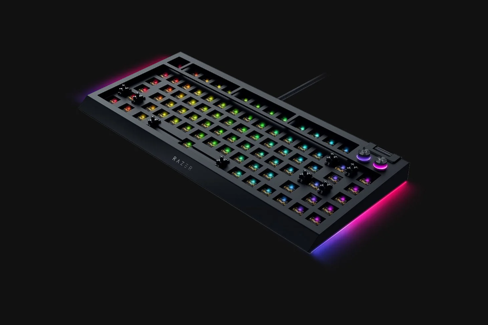 Razer представила свою первую игровую клавиатуру формата «barebones» (без переключателей и колпачков) — BlackWidow V4 75%. Клавиатура позволяет самостоятельно выбрать и установить предпочитаемые механические переключатели и комплект колпачков клавиш, сохранив при этом фирменный дизайн Razer и подсветку Chroma RGB. Несмотря на отсутствие переключателей и клавиш в комплекте, функциональность голой версии идентична полноценной BlackWidow V4 75%. Новинка поддерживает установку как 3-контактных, так и 5-контактных (PCB-mount) механических переключателей. Для обеспечения максимальной скорости отклика используется технология Razer HyperPolling с частотой опроса до 8000 Гц. Razer уделила особое внимание акустике и эргономике BlackWidow V4 75%. Клавиатура оснащена заводскими предварительно смазанными стабилизаторами для плавного срабатывания длинных клавиш. Внутренняя конструкция включает двухслойную звукопоглощающую пену и предварительно нанесенную звукопоглощающую ленту, что снижает резонанс