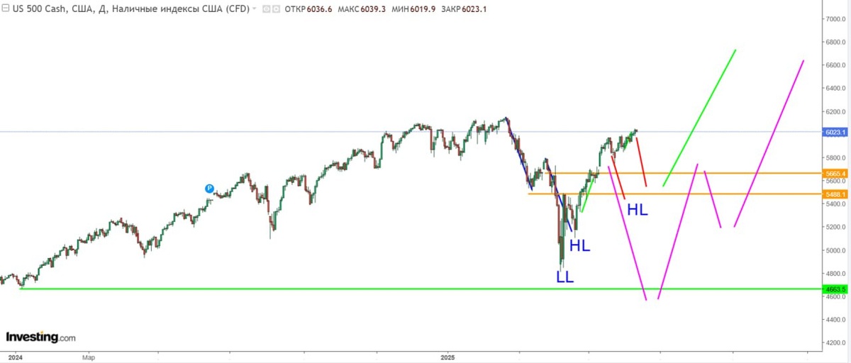 ☀️ Всем добрый день и позитивного настроения! Опять будем разбирать индекс S&P 500 Вроде график тот же, что и давали вам 2 недели назад (смотреть тут) Но ситуация развивается уже несколько иначе Точнее не так. Она по сути остается в идее возможной ближайшей коррекции, но уровни от которых она пойдет поднимают 🆎 Собственно мы в прошлом обзоре и обозначали, что ждем Индекс повыше, около 6023 - 6061 пунктов по SPX Сейчас мы с вами видим эти уровни В четверг и пятницу пройдет Rollover фьючерсных контрактов - это когда основные объемы крупных игроков переходят в новые контракты, то есть в текущей ситуации - в сентябрьские А учитывая, что они еще и в контанго к июньским, то ценник там выше Как следствие складывается предположение, что сентябрьский контракт готовят под продажу Однако это совершенно не значит, что коррекция начнется в ближайшие дни и даже недели Потому что на следующей неделе экспирация, а июньский контракт был явно бычьим. И ничего не мешает его подержать в текущих уровнях и