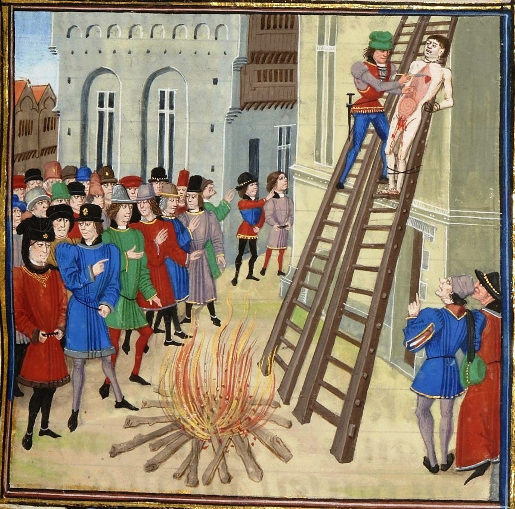 В средневековье казни были жестокими и негуманными. Осуждённых сжигали заживо, привязывали к колесу и ломали им конечности молотом, а если они не умирали, то оставляли медленно умирать на колесе.