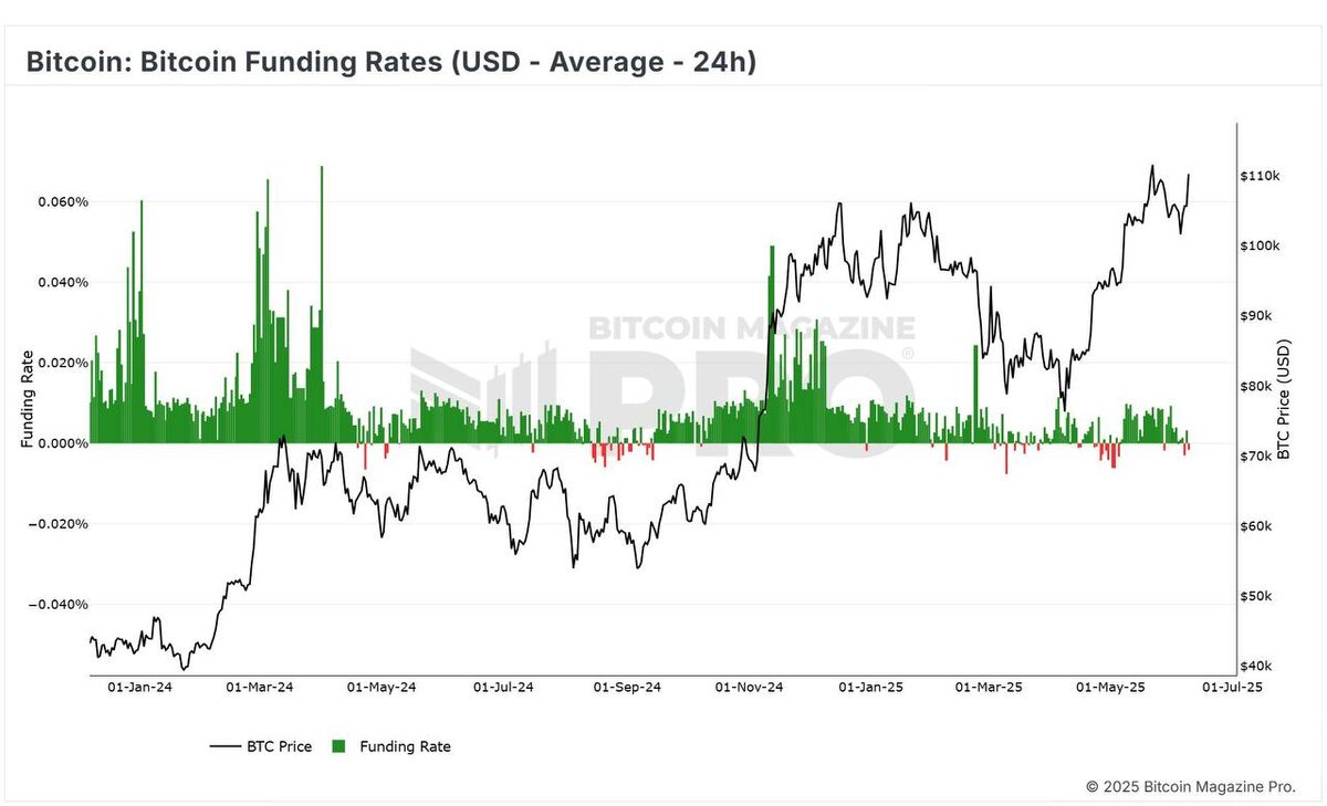 Когда рынок идёт вверх на негативных ставках — это нечто. Перед вами график Funding Rate по биткойну за последние полгода. Что важно: — В начале 2024 рост шёл на перегретом фьючерсном рынке: ставки были высоко положительные (зелёные пики). — Сейчас? Цена снова около хаёв, но ставки либо у нуля, либо в минусе. Это значит, что: — Лонги на фьючах не доминируют. — Рынок растёт не из-за плечевого FOMO, а на фоне спотового спроса. — А значит, у быков ещё есть порох в пороховницах — и ликвидационная пушка не заряжена. На что стоит обратить внимание? 1. Если funding останется у нуля, движение может продолжиться спокойно — без резких чисток. 2. Если ставки резко вырастут — ждём волну ликвидаций и коррекцию. 3. А пока: рынок в балансе, и это может быть фаза «затишья перед выстрелом». Если интересно — могу сделать серию постов о том, как анализировать funding rate, open interest и другие фьючерсные метрики, чтобы понимать настроение толпы. Ставьте 🔥, если это нужно. #биткоин #фьючерсы