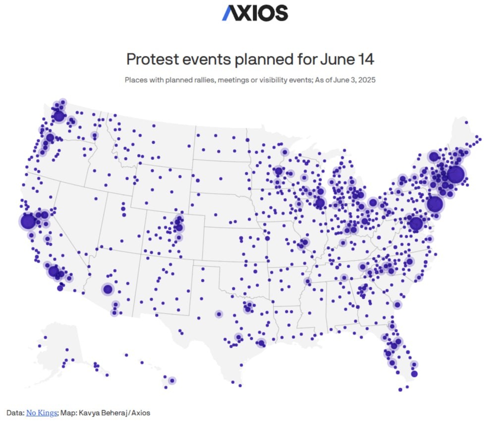 Axios: В субботу протестующие выйдут на улицы и в общественные центры по всей стране. Организаторы ожидают, что это будет крупнейшая однодневная акция против президента Трампа с начала его второго срока полномочий. Широкомасштабное движение будет противостоять многомиллионному военному параду Трампа в Вашингтоне. «No Kings — общенациональный день неповиновения», — написали организаторы. «От городских кварталов до маленьких городков, от ступеней зданий суда до общественных парков мы принимаем меры, чтобы отвергнуть авторитаризм». Более 100 продемократических правозащитных групп объединяют усилия для организации мероприятий No Kings. Что они говорят: «Дональд Трамп хочет, чтобы на его день рождения вывели танки и устроили телевизионную демонстрацию доминирования», — говорится на сайте No Kings . «Зрелище, призванное выглядеть как сила. Но настоящая сила не инсценируется в Вашингтоне. Она возникает повсюду». Во вторник Трамп заявил , что любые протесты во время субботнего парада буд