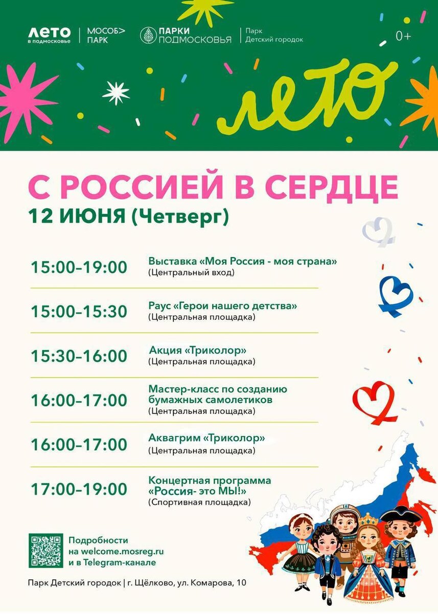 День России в Щёлкове! 🇷🇺 Уже завтра наша страна будет отмечать День России – праздник, символизирующий многовековую историю, единение народов и уникальные культурные традиции. По традиции в нашем округе пройдут различные праздничные мероприятия. Вас ждут: ▫️ выставки; ▫️ концертные программы; ▫️ мастер-классы; ▫️ фотозоны; ▫️ патриотические акции. ✈️ Также напоминаем, что в Центральном музее Военно-воздушных сил пройдёт фестиваль «Крылья Победы» – вы сможете увидеть демонстрационный полёт современных авиамоделей, реконструкцию воздушных боёв с участием легендарных «Илов», «Яков» и «Лавочкиных» и многое другое. 📎 Все афиши в альбоме. #культуращёлково #летовподмосковье