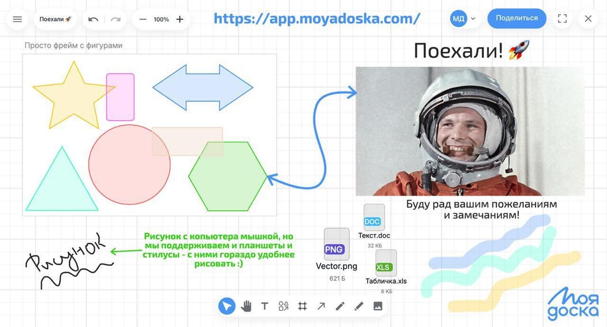 ⚡️ Развитие сервиса Друзья, как вы знаете, я с вниманием отношусь к тому, что вы пишете в комментариях, и стараюсь внедрять тот функционал, который вы просите: ➖ Синхронизация с командой в режиме режиме реального времени ➖ Работа с файлами: хранилище для файлов, фото с обрезкой по разным маскам, воспроизведение аудио, открыте PDF-файлов и раскладка их на доске ➖ Набор фигур ➖ Стикеры ➖ Стрелочки для связи элементов ➖ Фреймы в разных форматах ➖ Карандаш, маркер, ластик ➖ Текст (куда без него) ➖ Куча разных настроек и мелочей которые я устану перечислять На момент написания поста сервис функционирует бесплатно! - мне важно получить от вас обратную связь, чтобы сделать сервис максимально комфортным и удобным! Буду ждать в комментариях от вас пожелания по тем инструментам которые сейчас необходимы вам! Если вы недавно пришли, то МояДоска включена в Реестр Отечественного ПО, а здесь я рассказал как появился проект. Улучшая сервис для вас, @moyadoska | moyadoska.com ❤️