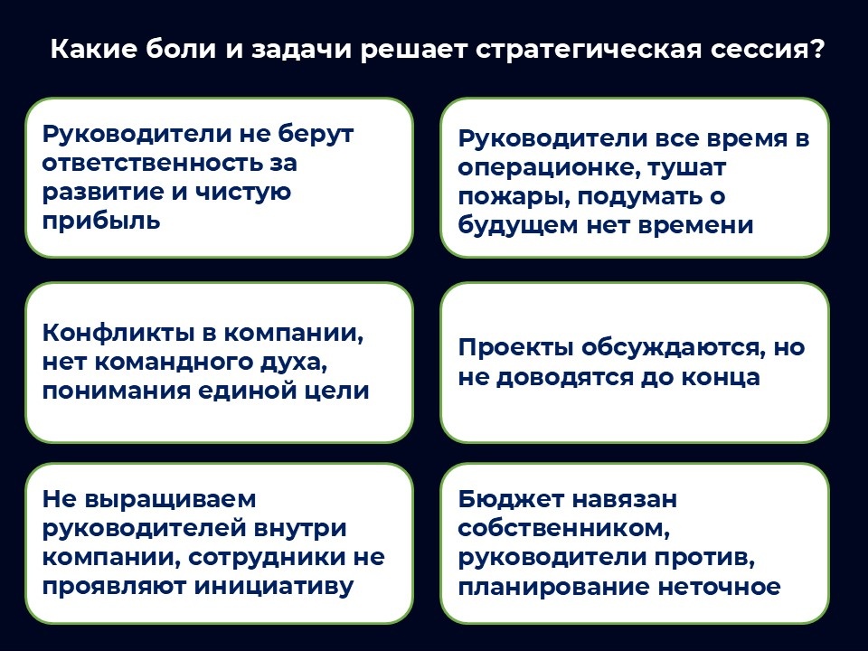 Ловили себя на этом? • Я собственник, есть команда, но тащу бизнес на себе, без меня все развалится • Я вынужден принимать большинство решений самостоятельно, вместо стратегии занимаюсь рутиной и «тушу пожары» • Работаем активно, но как будто стоим на месте, нет роста, сотрудники не берут на себя ответственность за общий результат • Отделы живут сами по себе, есть конфликты и недопонимания • Нет системы и стандартной схемы действий - сплошная импровизация • Я понимаю, что результат делается руками команды, хочу начать выстраивать систему Звучит заманчиво, а как этого добиться – вопрос технологии, я ей владею! Проведу эффективную стратегическую сессию для руководителей вашей организации Мы не собираемся поклеить стикеры, похлопать в ладоши и поиграть в управленческие игры, только конкретика + фокус важном. Цель сессии: планы ставятся командой (снизу вверх) и выполняются. Цифры достигаются, прибыль растет, проекты реализуются, управлять бизнесом - одно удовольствие На сессии вы вместе с