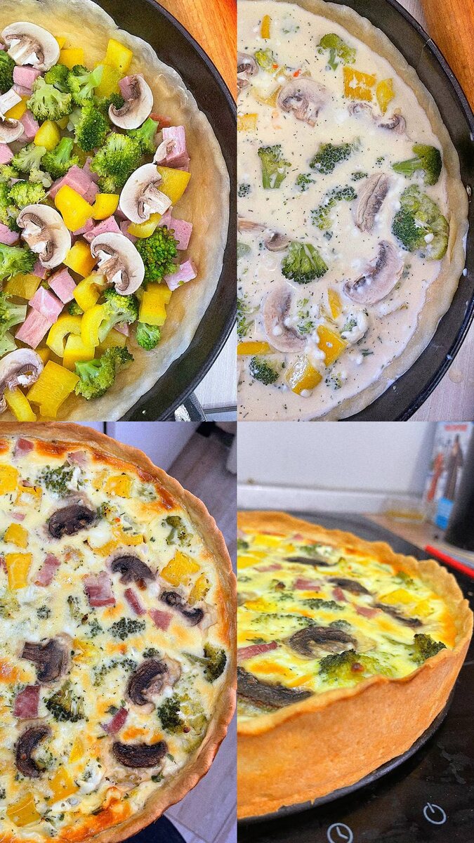 -Яйцо - 2 шт. -Масло сливочное (холодное) -60 г -Мука - - 240 г. -Соль - 0,1 ч. ложки -Сыр сливочный - 100 г -Сливки - 100 мл -Яйца - 2 шт. Начинку выбираем любую, прекрасно подходит и рыбка и курочка и ветчина. Овощи прекрасно все это дополняют. ✔Холодное масло порубите ножом на маленькие кусочки и выложите в миску. ✔Добавьте яйцо, соль и муку. Лопаткой соберите все ингредиенты в ком. ✔На ровной поверхности стола быстро замесите однородное тесто. Чем больше будет таять масло от тепла рук, тем больше тесто впитает муки. ✔Поместите тесто в разъёмную форму и распределите по всей поверхности дна, а также сформируйте бортики высотой около 3 см . ✔Для заливки соедините в глубокой миске яйца, сливки, сливочный сыр и соль. Перемешайте заливку. ✔Начинку переложите в форму, равномерно распределяя по тесту. Залейте начинку яично-сырной заливкой. ✔Выпекайте 40-45 минут(зависит от вашей духовки) в разогретой до 180 градусов духовке, до образования румяной корочки на тесте и приятного жёлто-коричн