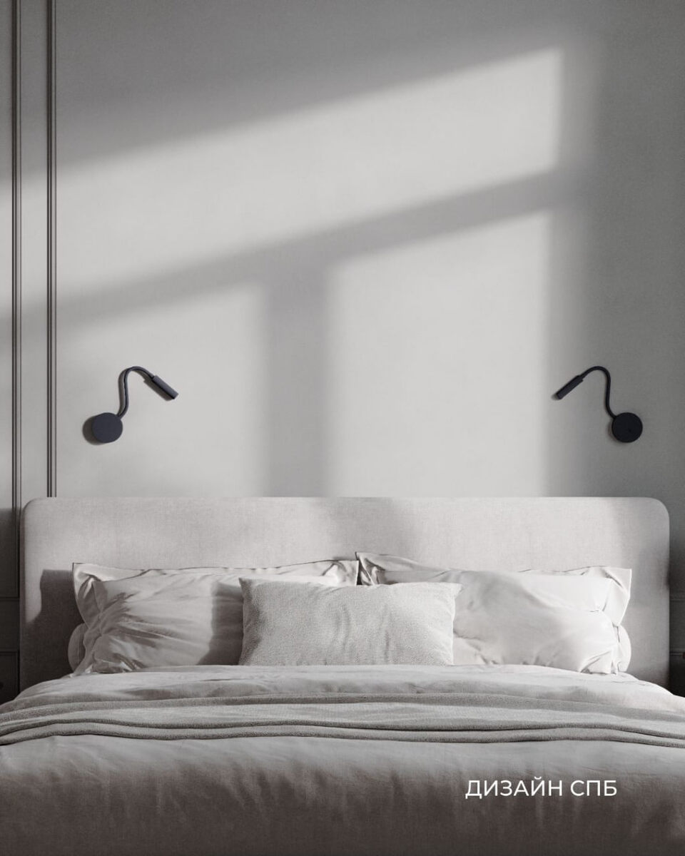 Спальня, в которой продуманны все детали: спокойная цветовая палитра, комфортная кровать, рабочее место с подсветкой и чистый, минималистичный интерьер. Пространство комнаты заполнено тишиной и комфортом. Разработка и реализация дизайн-проекта "под ключ". Звоните: +7 (812) 670-07-47