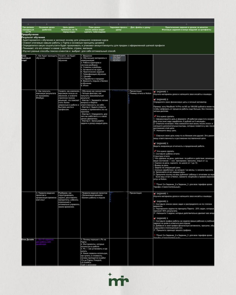 Часто к нам приходят посмотреть 👀 🔴как создается программа? 🔴какой первый этап? 🔴могу ли я сначала сделать программу на листке, а потом продавать? Эти и другие вопросы всегда решаются в начале разработки курса И если вы ещё зеленый 💚 Хотите «только сделать программу», а дальше записать и создать все сами – для вас есть отдельная услуга Создание программы ✨ Благодаря необходимому количеству встреч с методологом, у вас появляются два важных файла, которые можно использовать для продаж ещё не готового курса Что же это за файлы? Давайте глядеть 👀 1️⃣ программа в таблице с проработанными тезисами для уроков и домашек 2️⃣ готовая к внедрению гемификация Если вы уже готовы создавать программу, пишите нашему менеджеру @vmirdosh