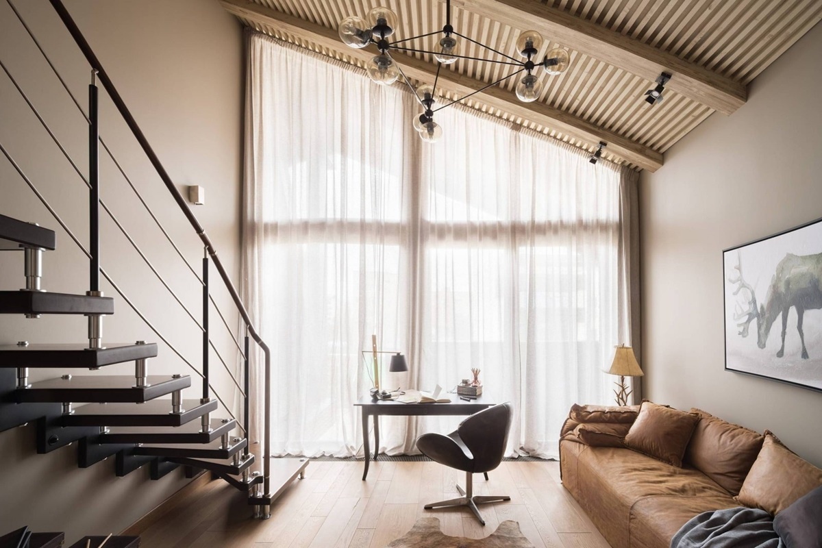 Учитывая, что в домах с высокими потолками без перекрытий помещения просторные, нет необходимости их дополнительно увеличивать, используя только шторы белого или светлого цвета. Можно выбирать любой подходящий вариант, но следует быть осторожным с использованием черных, сильно темных штор, особенно если предусмотрен ламбрекен, верхняя часть окна закрыта французскими или римскими шторами, причина та же – темный цвет создаст угнетающую обстановку.