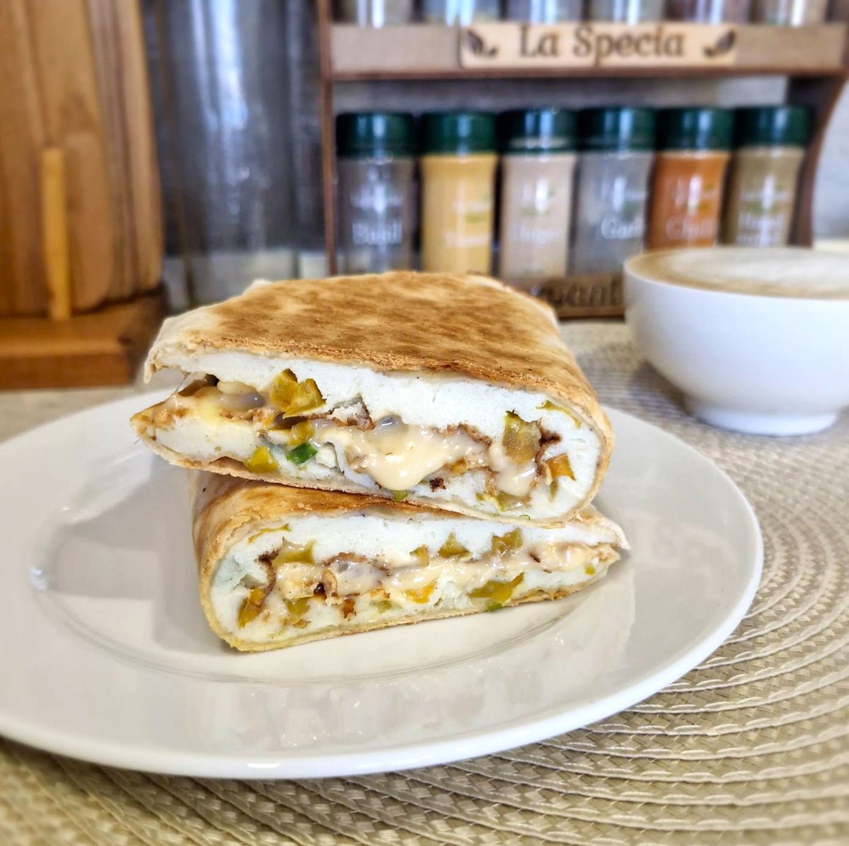 Что может быть проще омлета? Яйца, немного молока, соль, перец… Сегодня предлагаю приготовить не простой омлет, а в хрустящей, золотистой тортилье, да еще и с кусочками сладкого перца и зеленью. Звучит аппетитно, правда? И самое главное – быстро! Всего 10 минут, и у вас на столе – сытный, полезный и невероятно вкусный завтрак. Готовы? Тогда начнем! Для приготовления на 2 порции нам понадобится: Сегодня я взяла домашний очищенный от семян замороженный сладкий перчик. Он не теряет вкусовых качеств и свойств при заморозке и удобен в хранении. Нарезаем его мелкими кубиками. Лук нарезаем колечками, яйца взбиваем с молоком и солью в отдельной чашечке. Сыр натираем на мелкой терке. Разогреваем сковороду и обжариваем кубики перца минуты 3-4 на среднем огне. Солим, перчим, добавляем лук и заливаем яйцами. Можно добавить щепотку любимой сушеной зелени. Когда омлет начнёт схватываться , накрываем его сверху тортильей и жарим ещё минуты 2, затем аккуратно переворачиваем наш омлет тортильей