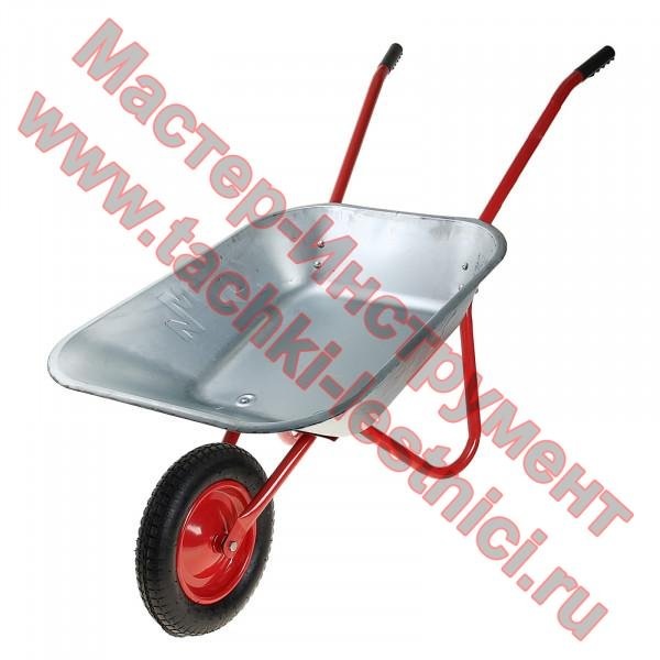 Начнём с самых простых моделей: это одноколёсная садовая тачка. Конструкция – проще и бюджетнее некуда: одно-единственное колесо, корыто небольшого размера, изогнутые опоры стальной рамы, резиновые рукояти-грипсы – вот в целом и всё.