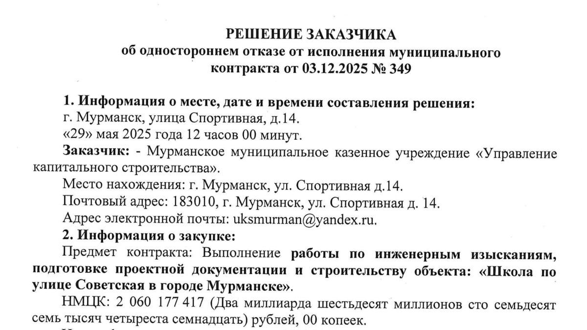 В ответ на пост Что-то неладное творится с построенной школой на Советской, известной сейчас как губернаторский лицей. По состоянию на 10 июня 2025 года известно, что областной УКС (Заказчик) в одностороннем порядке расторг госконтракт на стройку. Напомню, согласно первоначальным данным возведение здания школы и обустройство прилегающей территории было оценено (НМЦК) в 690 млн рублей. Однако, в процессе подготовки и реализации проекта НМЦК выросла до 2,060 млрд. «Арктический Обозреватель» выяснил, что причиной расторжения контракта стала совокупность факторов. В частности, работы были выполнены с отступлениями от проектной документации, которые не были устранены в ходе проверок (отклонения от проекта обнаружены в фундаментах, блоках, вентиляции и других). Кроме того, на объекте с августа 2024 года не организован и не ведется авторский надзор, несмотря на обязательства. Представители Заказчика также отметили, что подрядчик фактически бездействовал на объекте в последние месяцы. А е