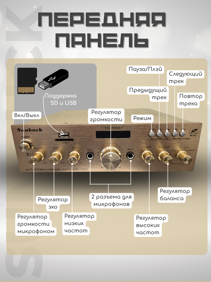В мире компактных усилителей сложно найти баланс между функциональностью и простотой. Но Sunbuck TAV-500BT делает это уверенно. Он — не просто усилитель, а настоящий центр домашнего звука. Почему стоит обратить внимание? Этот малыш может больше, чем кажется на первый взгляд. Несмотря на скромные габариты, у него — настоящая RMS-мощность 40 Вт на канал, чего вполне достаточно для квартиры, мастерской или дачного домика. У него всё под рукой: