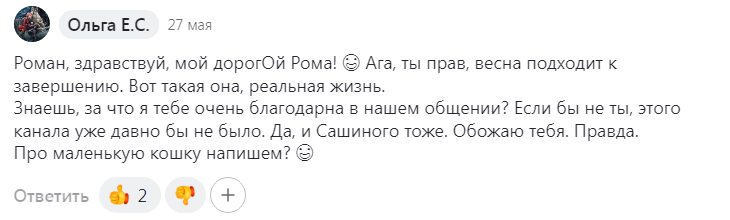 Здравствуйте. Это как бы эпиграф 👇😃 Или вместо предисловия. Или даже пролог, о! Здравствуйте. История эта из жизни. Из жизни Ромы. Он уже несколько лет - объект моего пристального внимания и навязчивого (или всё-таки ненавязчивого?) общения. :) Как и вся его семья. Вернее, все его домочадцы. Потому что в семью у них входят и близко, и далеко живущие дети, внуки, родители, до них я не достаю, а вот домочадцы - это у них дома, их состав иногда меняется. И всё чаще в сторону увеличения. Потому как периодически семья Ромы, а если конкретнее, то он сам и его милая жена Оксана кого-нибудь спасают. Бывает, правда, они покупают своих питомцев. Так в прошлом году у них появились птички (рыбки уже были). Но вот еще одно, на этот раз бесплатное живое приобретение конца прошлого года - это маленькая кошечка, спасенная ими из холодного подъезда в прошлом ноябре. Ну, как маленькая ... совсем малюсенькая. Тогда она была маленькая, да. А сейчас! Впрочем, обо всем по порядку. Пишет мне как-то Ро