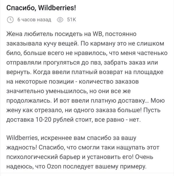 Wildberries вводит платную доставку для некоторых покупателей Маркетплейс Wildberries начал тестировать платную доставку для клиентов с низким процентом выкупа заказов. Как пояснили в пресс-службе компании, стоимость доставки может зависеть от дальности перевозки, способа транспортировки и истории покупок конкретного пользователя. В компании подчеркивают, что это не нововведение, а давно существующая практика, которая помогает оптимизировать логистику. Ранее гендиректор Wildberries Татьяна Бакальчук объясняла, что подобные меры направлены в первую очередь против недобросовестных покупателей, а не против обычных клиентов. Маркетплейс продолжает экспериментировать с различными механизмами доставки, чтобы товары оставались доступными во всех регионах присутствия компании.
