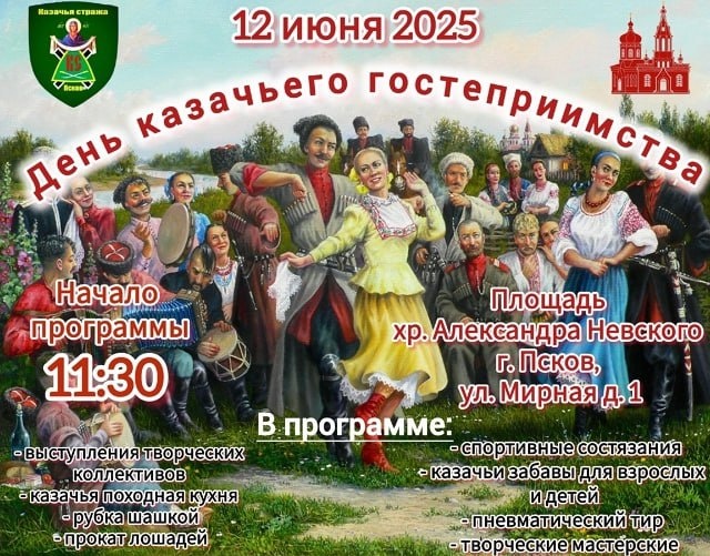 День Казачьего Гостеприимства 🗡 🎉 Яркая программа с казачьей культурой, состязаниями и песнями под гармонь. 👇 В программе: концерт творческих коллективов с казачьими и народными песнями; показательными выступлениями и танцами; прокат лошадей; стрелковый пневматический тир; тематическая фотозона с казачьей амуницией; казачьи забавы и состязания на ловкость и силу для всех желающих; мастер-класс по фланкировке и рубке казачьей шашкой; чеканка сувенирных монет и творческие мастерские для взрослых и детей. 🥘 Походная кухня предложит вам: Шулюм "Казацкий" наваристый; Плов "По-казачьи" по рецепту XVI века; Уха "Донская из трёх рыб"; Хлеб монастырский, квас бочковой; Самоварный крепкий чай с блинами, пирогами и сладостями восточными. 📆 12 июня с 11.30 до 14.30 📍 улица Мирная, 1 (Площадь храма Александра Невского) Оставайтесь с нами #НашаПсковскаяобласть
