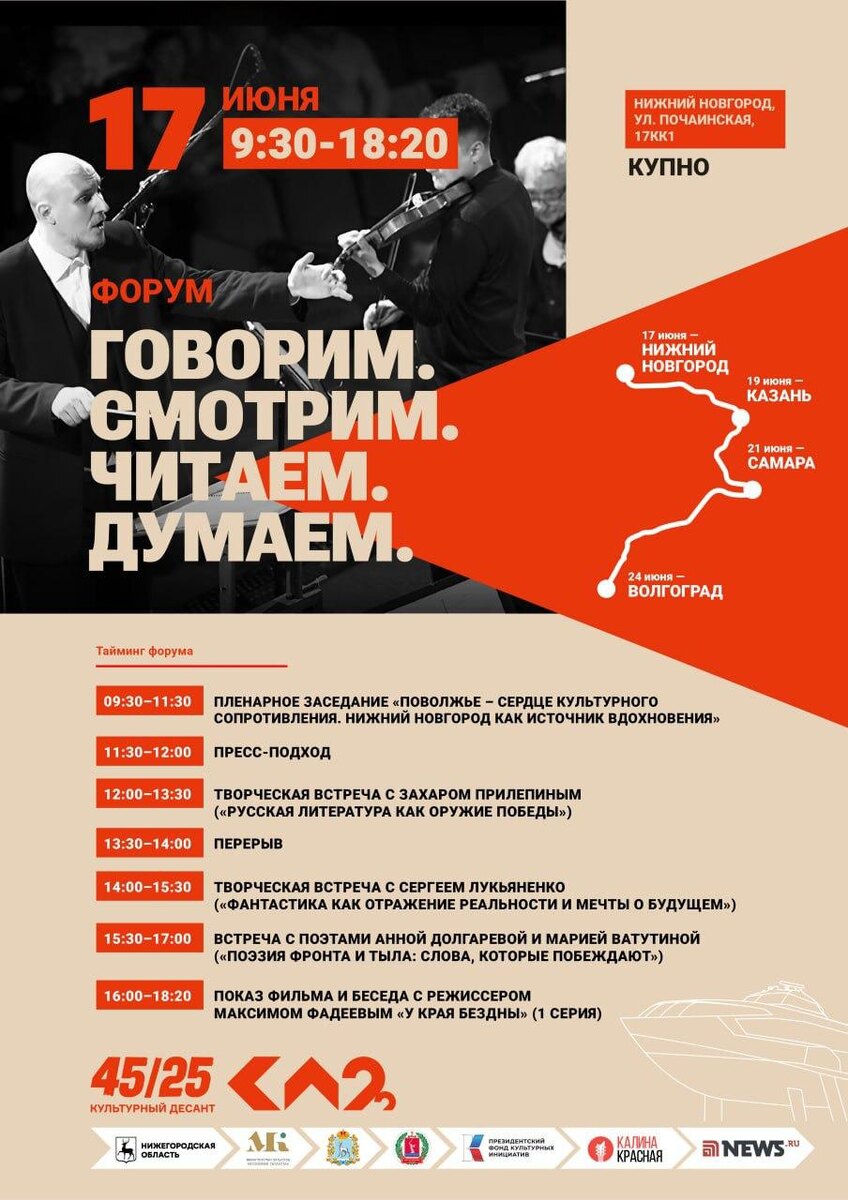 Первые два города. Нижний Новгород, 17 июня. ССЫЛКА НА РЕГИСТРАЦИЮ: https://tickets.ka22.agency/ Казань, 19 июня. ССЫЛКА НА РЕГИСТРАЦИЮ: https://tickets.ka22.agency/ Далее: Самара Волгоград Одинцово Воронеж Москва О всех выступлениях будет объявлено заблаговременно.