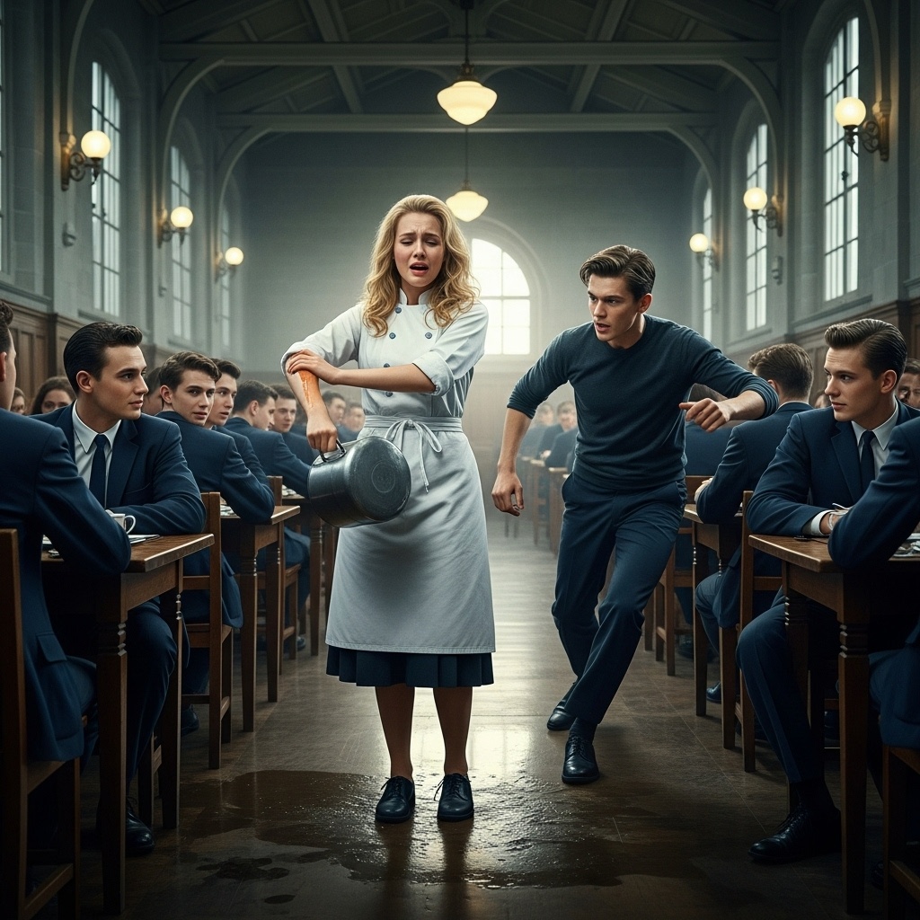 Кульминация этой фазы наступила через несколько дней. Был час пик, когда из кухни разносили ужин. Женя стоял в дальнем конце коридора и увидел, как Шутов, лениво опершись о стену, наблюдает за кухонной дверью. Из неё вышла Маша, неся огромную, дымящуюся кастрюлю с супом. Она держала её обеими руками, напрягаясь под её весом. В тот момент, когда она поравнялась с Шутовым, другой старшеклассник, стоявший напротив, «случайно» пролил на пол целое ведро с жирной, мыльной водой.