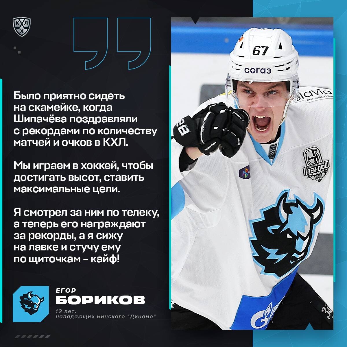 🦬 Егор Бориков в сезоне 2024/2025 дебютировал в розыгрыше Кубка Гагарина, забросил семь шайб и повторил рекорд Евгения Кузнецова по голам в плей-офф для игроков до 20 лет. В своем монологе в рубрике «Дорогу молодым» на KHL.ru нападающий минского «Динамо» рассказал о работе с Дмитрием Квартальновым, эмоциях от игры с Вадимом Шипачёвым и итогах прошедшего сезона.
