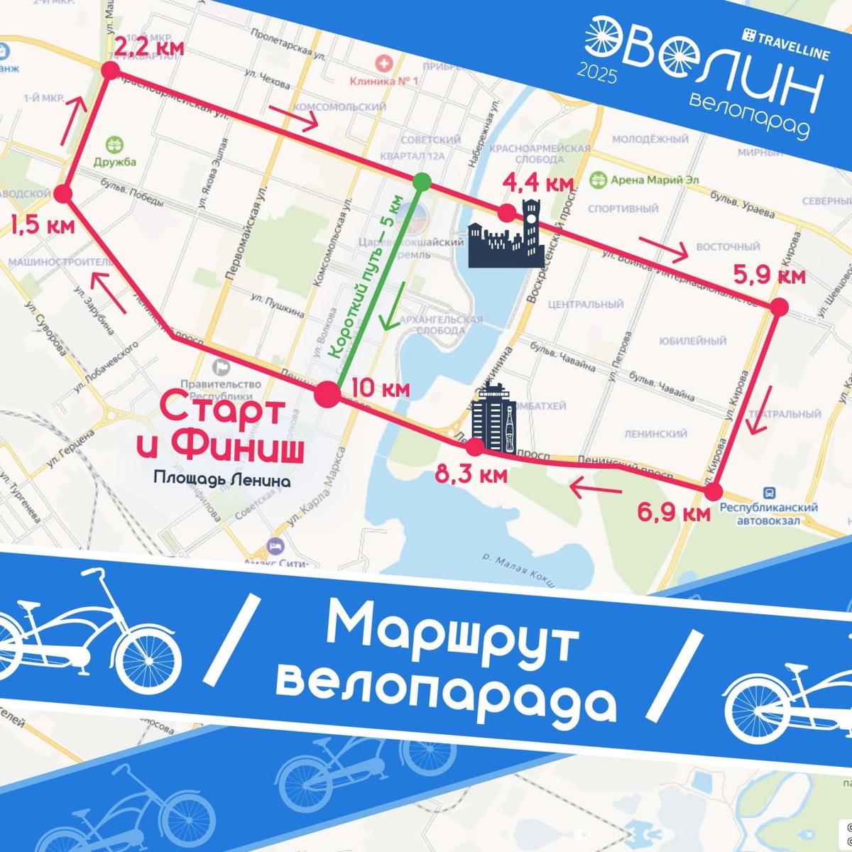 🚴♀️ Велопарад «Эвелин» пройдет в Йошкар-Оле 15 июня Спортсмены по традиции стартуют с площади им. В.И. Ленина. Для участников подготовлены две дистанции: 5 и 10 километров. 📍Программа велопарада «Эвелин-2025»📍 10:00 – 11:30 – регистрация участников; 10:00 – работа площадок партнеров, розыгрыши призов, игры для детей и взрослых, концертная программа; 11:30 – торжественное открытие и построение колонны; 12:00 – старт; 12:30 – обед; 13:00 – розыгрыш призов, дискотека; 14:00 – завершение парада.