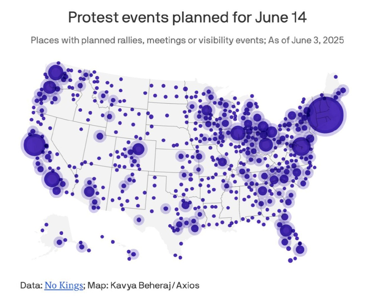 14 июня, в день рождения Трампа, в США планируются протесты в 1800+ городах. Название акции — «Без королей».